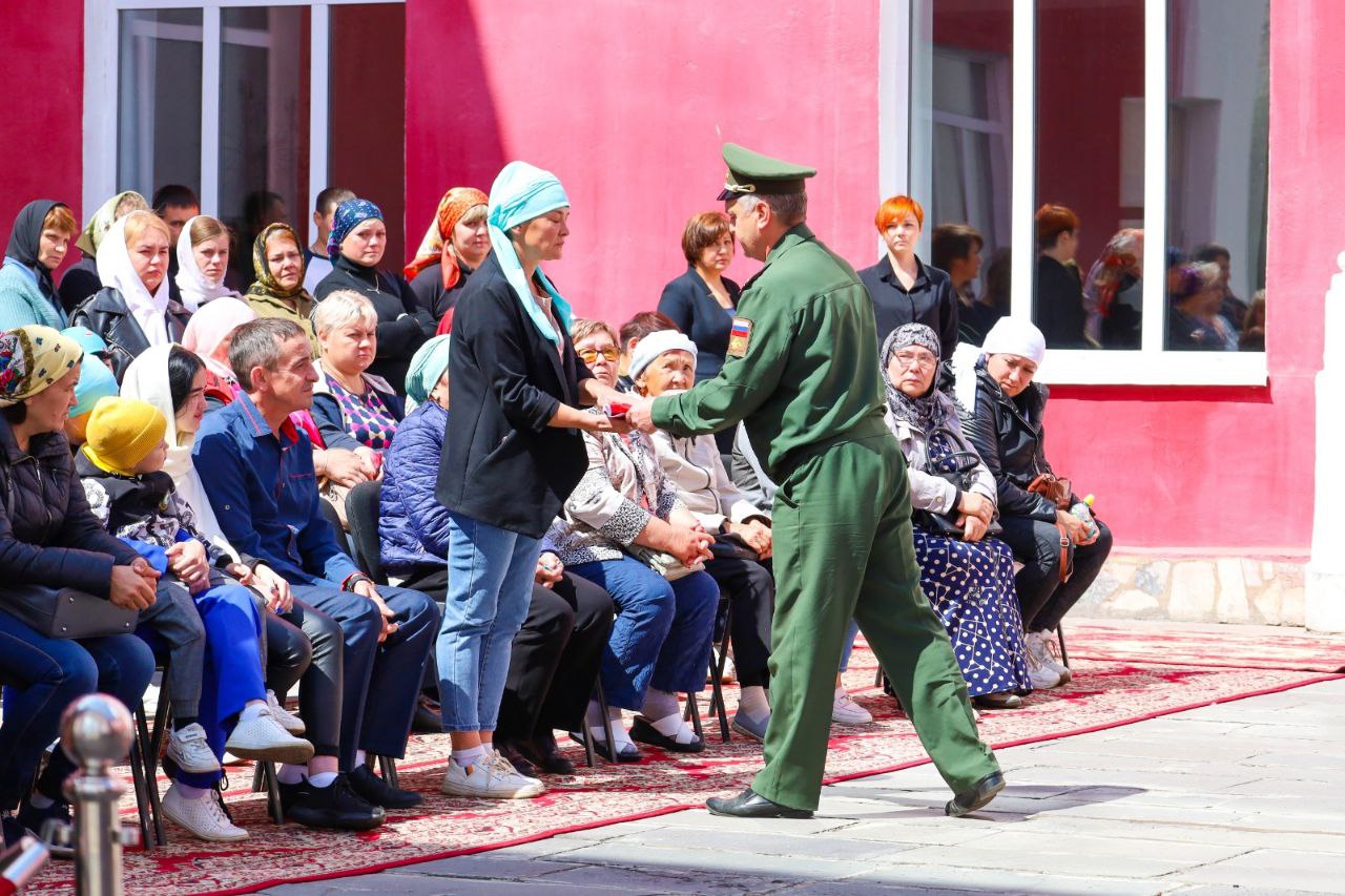 По традиции в завершении траурного митинга матери военнослужащего передали флаг Российской Федерации.
